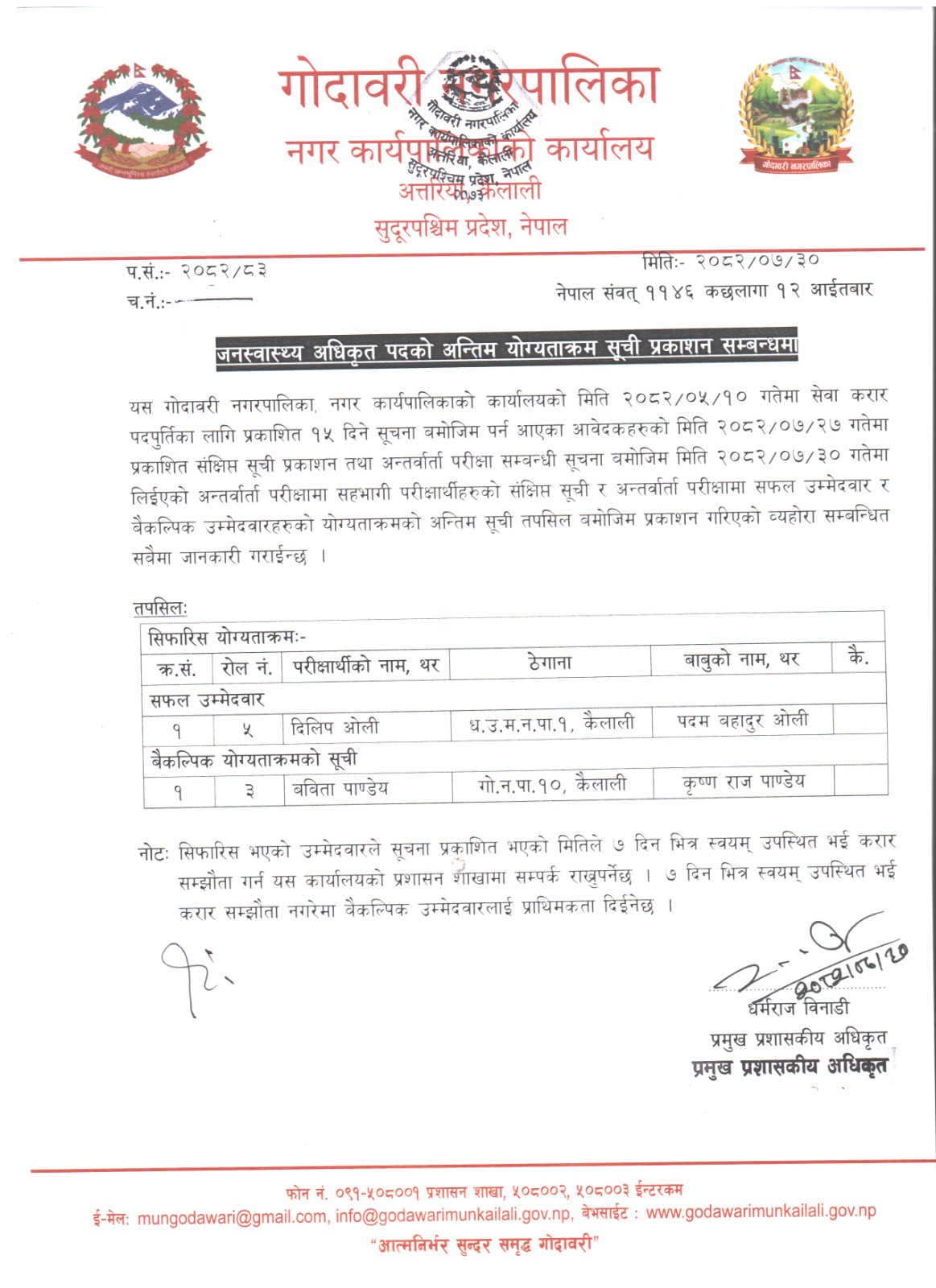 जनस्वास्थ्य अधिकृत पदको अन्तिम योग्यताक्रम सूची प्रकाशन सम्बन्धमा ।