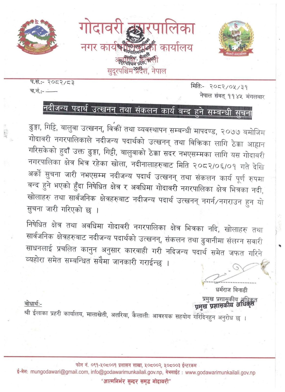 नदीजन्य पदार्थ उत्खनन् तथा संकलन कार्य बन्द हुने सम्बन्धी सुचना