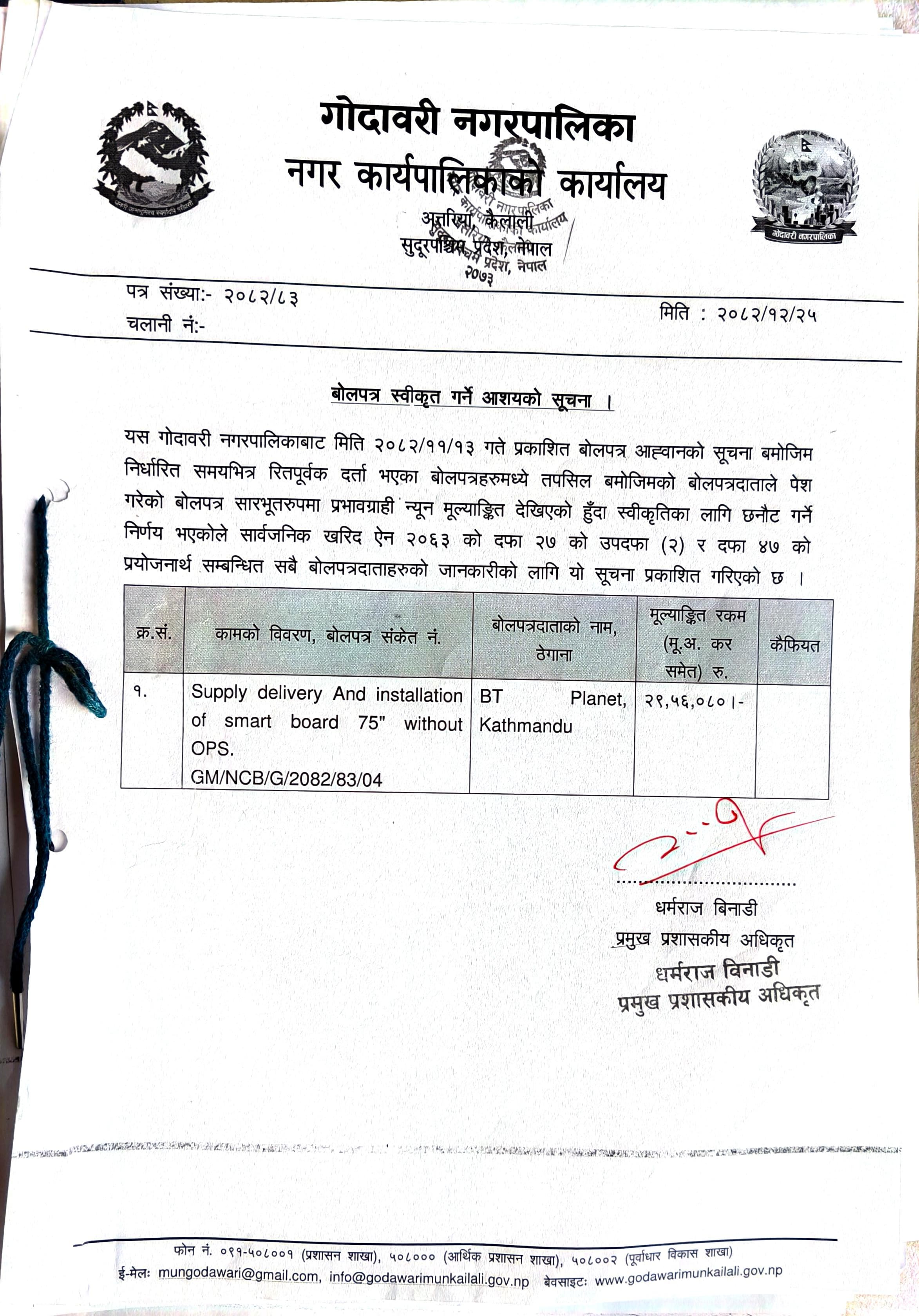 वोलपत्र स्वीकृत(ऽmart board) गर्ने आशयको सूचना ।