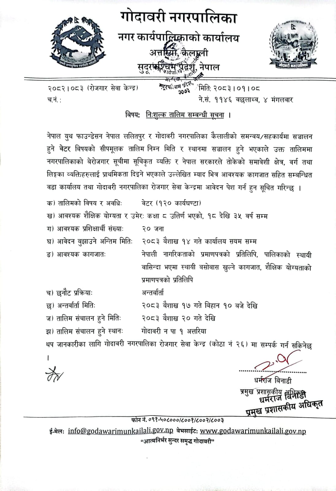 नि:शुल्क वेटर तालीम सम्बन्धी सूचना ।